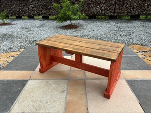 頑丈で安定感のある子供ベンチ椅子です。座面・足・横板等、すべてフチに丸みを付けてあります。足の部分が座面より若干幅広にできています。